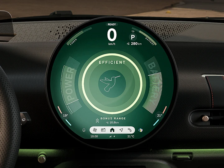 When you take your foot off the accelerator, or only apply moderate pressure to the brake, your cars uses brake energy regeneration (recuperation). Driving in an anticipatory manner and avoiding heavy braking increases your range. Besides the speed at which you drive on motorways, the outside temperature has the biggest impact on the range. The performance of the battery drops with colder temperatures. We recommend pre-conditioning the cars interior to get the most out of your cars from the outset. As cooling or heating uses electric energy, we recommend cooling or heating your cars while it's charging to maintain its maximum range. Simply enter your preferred departure time including climate control on the MINI App or in the cars menu. That way, when you set off, you'll automatically enjoy your ideal interior temperature and the state of charge you entered.
